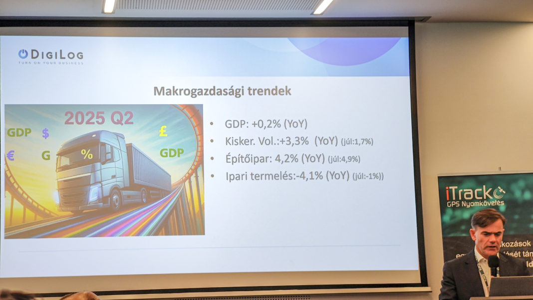 Lajkó Ferenc, a DigiLog ügyvezetője a fuvarpiac aktuális helyzetének elemzésével kezdte a megnyitó beszédét. A számtalan pozitív és negatív előjelű gazdasági mutató közül kiemelte azokat, amelyek leginkább meghatározták az elmúlt néhány hónapot a korábbi évek azonos időszakaival összevetve. Bár a bruttó hazai termék (GDP) alig észrevehetően nőtt, a fuvarozói szakma nagyon is megérezte, hogy a GDP jelentős részét alkotó termelés több mint négy százalékkal visszaesett. Ennek köszönhetően a közúti fuvarozási teljesítmény és azon belül a belföldi szállításé még ennél is nagyobb mértékben zsugorodott. Az elmondottak alapján várhatóan tovább slankul majd a kínálati oldal. A nem elég rugalmas, nem elég diverzifikált és esetleg túlnőtt flották közül nem biztos, hogy mindegyik megmarad.