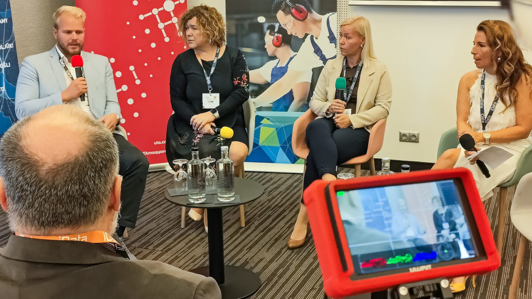 A harmadik országokból érkező járművezetők kapcsán szerzett tapasztalatokról folyatott kerekasztalbeszélgetést (balról jobbra) Varga Bálint, a K & V Kft. ügyvezetője, Kovács Mónika, a RollSped irodavezetője és Varjuné Horváth Tímea, a MENTON Jobs Kft. cégvezetője. A beszélgetést Gábor Orsolya, az iData Kft. marketingvezetője és egyben a rendezvény háziasszonya moderálta